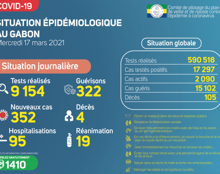 Gabon Matin vous livre le point journalier du Comité de pilotage du plan de veille et de riposte contre l’épidémie à Coronavirus au Gabon du 17 mars 2021.