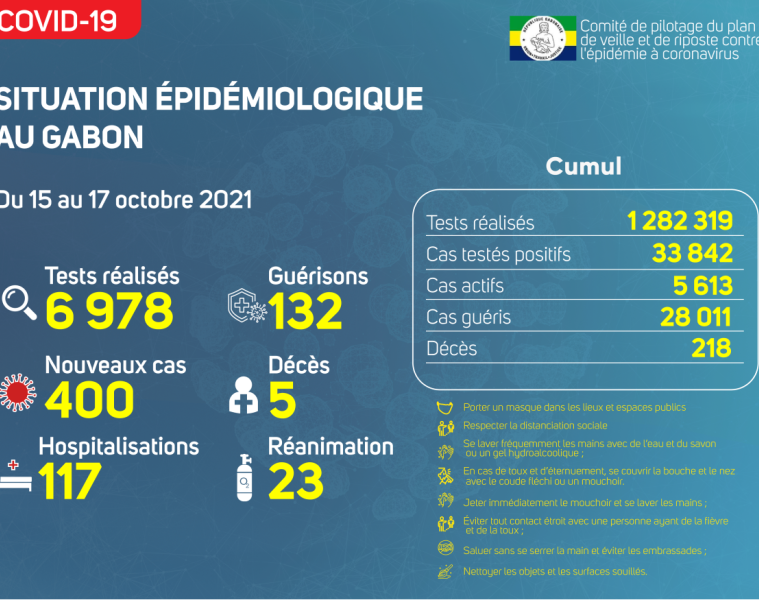 Nous avons enregistré 400 nouveaux cas positifs sur 6 978 tests réalisés, soit un taux de positivité de 5.7%, 117 personnes hospitalisées dont 23 en réanimation pour détresse respiratoire, 132 nouvelles guérisons et 05 nouveaux décès dont 04 à Libreville et 01 à Tchibanga.