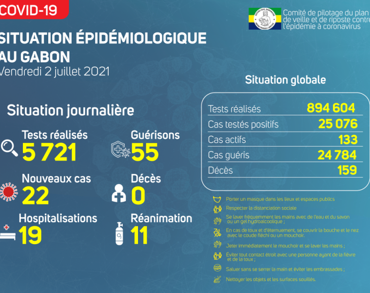 Gabon Matin vous livre le point journalier du Comité de pilotage du plan de veille et de riposte contre l’épidémie à Coronavirus au Gabon du 2 juillet 2021.